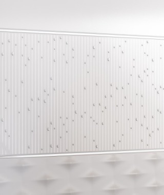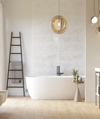 Декоративное панно в виде пальмовых листьев выполнено полупрозрачным объёмным материалом, тактильно напоминающим свежую росу или капли. Изящный декор в виде жемчужных бусин, будто стекающих по тонким перламутровым нитям, наполняет пространство свежестью тропического дождя. Ультратонкий серебристый бордюр перекликается с глянцевыми отблесками декора. Коллекцию дополняет белый рельеф «пики», а также бордюры и плинтус. Элегантный природный дизайн плитки и ненавязчивые цвета благодаря их особой подаче никогда не станут скучными.
